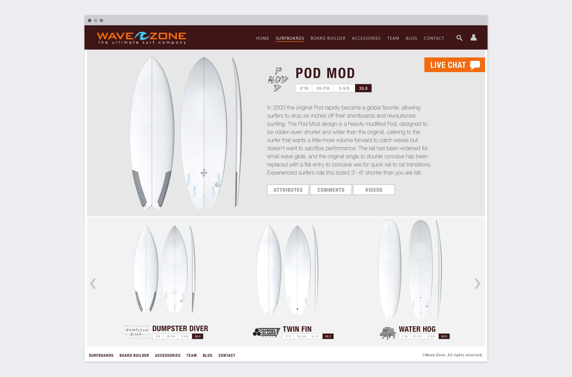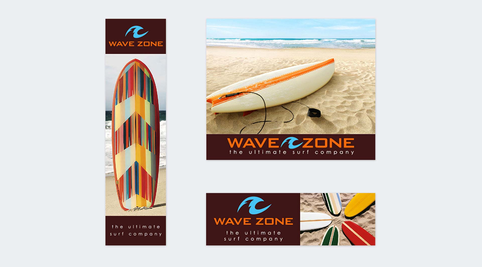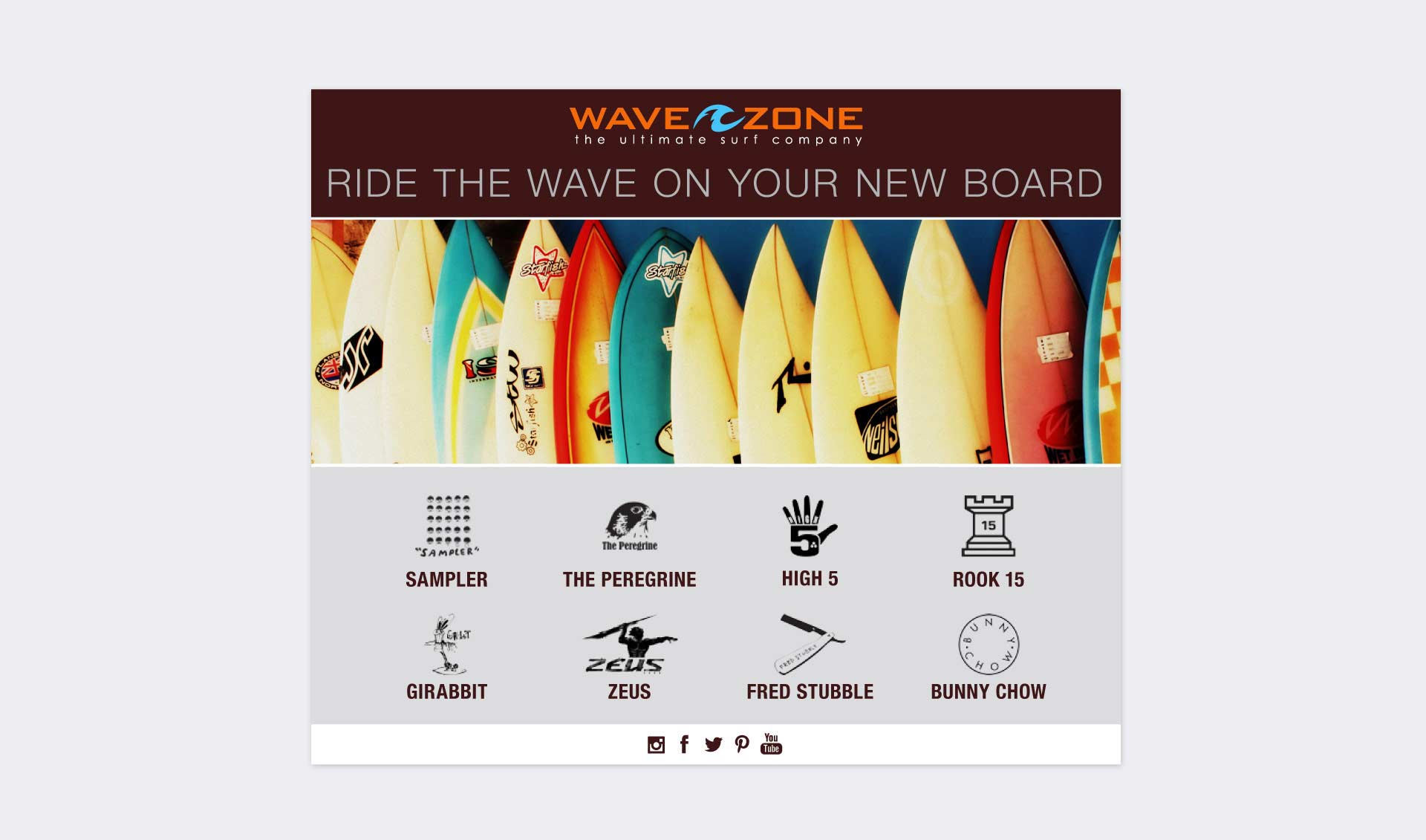 Wave Zone is a family owned business that offers wide range of surf boards and accessories for broad range of customers. Branding and marketing development includes identity and editorial design, product and packaging, e-commerce website, social media assets and display ads, email creatives, promotional items, brand style guide.